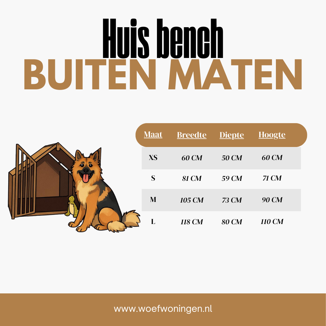 Onze benches zijn stevig, duurzaam en gemaakt om lang mee te gaan. Je kunt kiezen uit verschillende maten (voor kleine én grote honden), kleuren en afwerkingen. Denk aan een moderne uitstraling, mooie houttinten en gepoedercoat staal in jouw favoriete kleur. Veel klanten zoeken specifiek naar een hondenbench meubel, design hondenbench of hondenbench in meubels stijl — en precies daarvoor is Woefwoningen gemaakt.